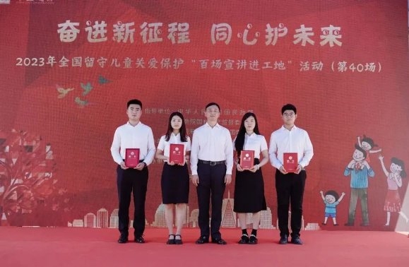 為2023年度全國留守兒童關(guān)愛保護(hù)“百場(chǎng)宣講進(jìn)工地”活動(dòng)志愿者頒發(fā)聘書