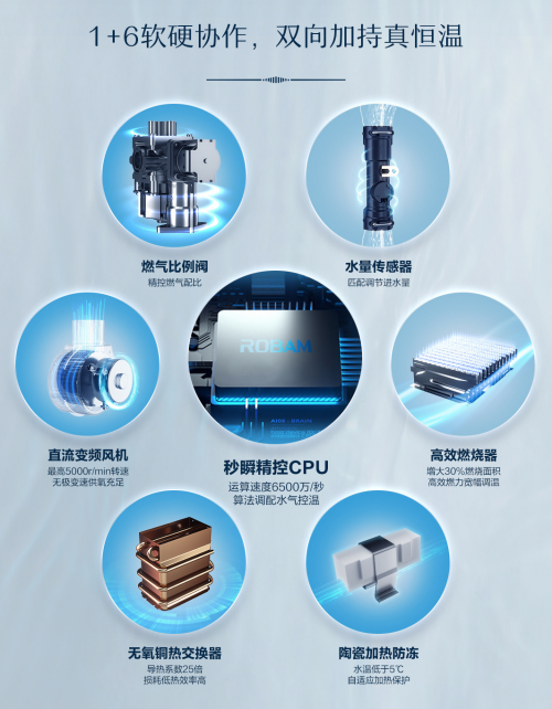 硬件上,【川】系列燃?xì)鉄崴鱄T730搭載秒瞬精控CPU,內(nèi)置全新升級的PID智能算法,可達(dá)6500萬/秒超速運(yùn)算,精準(zhǔn)計(jì)算水氣配比,使燃?xì)獗壤y和水量傳感器快速響應(yīng),迅捷精控持久恒溫。水流量傳感器,可精準(zhǔn)調(diào)節(jié)進(jìn)出口水量,在CPU的配合下實(shí)現(xiàn)水溫恒定;燃?xì)獗壤y,實(shí)時精控燃?xì)庥昧?#xff0c;高能效穩(wěn)定控溫;高效燃燒器,創(chuàng)新增氧V型火排,增大30%燃燒面積,增強(qiáng)89.68%燃燒效率,削弱15%運(yùn)行噪音,分段穩(wěn)然技術(shù)讓小火中火大火靈活調(diào)控,實(shí)現(xiàn)35-60℃寬幅調(diào)溫。直流變頻風(fēng)機(jī),最高5000r/min轉(zhuǎn)速無極變速高效供氧充足。高效無氧銅熱交換器,除了導(dǎo)熱性耐腐蝕性出色,還具備更強(qiáng)的熱沖擊性能。陶瓷加熱防凍,當(dāng)水溫低至5℃,四個陶瓷加熱器便會啟動加熱保護(hù),無懼國內(nèi)高寒天氣,-20℃也能安心熱浴。1+6的軟硬件協(xié)作,便可讓【川】系列燃?xì)鉄崴鱄T730輸出澎湃熱水,給予你舒適的沐浴體驗(yàn)與不間斷的溫暖關(guān)懷。