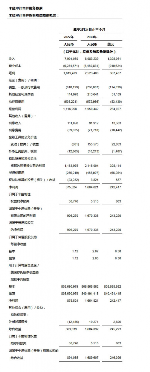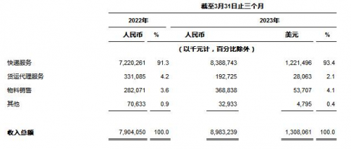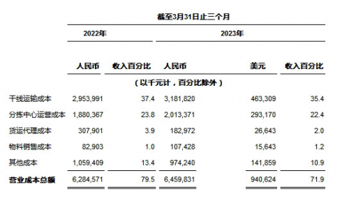 ?收入總額 為人民幣8,983.2百萬(wàn)元(1,308.1百萬(wàn)美元),較2022年同期的人民幣7,904.1百萬(wàn)元增長(zhǎng)13.7%。核心快遞服務(wù)收入較2022年同期增長(zhǎng)16.1%,該增長(zhǎng)是由于包裹量增長(zhǎng)20.5%及單票價(jià)格下降3.7%的綜合影響所致。貨運(yùn)代理服務(wù)收入較2022年同期減少41.8%,該減少主要是由于全球經(jīng)濟(jì)疲弱導(dǎo)致跨境電商需求和定價(jià)下降所致。物料銷售收入主要由打印電子面單所需的熱敏紙銷售收入組成,同比增長(zhǎng)30.8%,該等增長(zhǎng)與包裹量增長(zhǎng)趨勢(shì)吻合。其他收入主要由金融貸款業(yè)務(wù)組成。