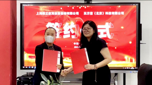 東方童(北京)科技有限公司文化傳媒事業(yè)部總經(jīng)理尹健穎、上海昂立教育投資咨詢有限公司研學(xué)項(xiàng)目負(fù)責(zé)人金玫伶舉行簽約儀式