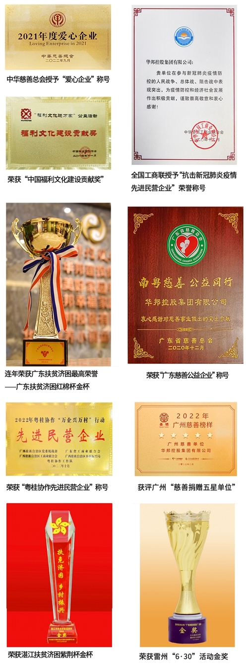 永葆初心,載譽前行。華邦控股集團自成立以來,將社會責任提高到自身發(fā)展的戰(zhàn)略高度,積極回報社會,持續(xù)增進民生福祉,愛心善舉獲得社會各界的肯定和贊譽,慈善影響力與日俱增:榮獲中華慈善總會愛心企業(yè)、全國抗擊新冠肺炎疫情先進民營企業(yè)、中國福利文化建設貢獻獎、粵桂協(xié)作先進民營企業(yè)、廣東扶貧濟困紅棉杯金杯、廣東百佳愛心幫扶企業(yè)、湛江市紫荊杯金杯、雷州市扶貧濟困日活動金獎等榮譽,獲評廣州最具影響力慈善企業(yè)、廣州慈善企業(yè)榜樣、慈善捐贈五星單位。