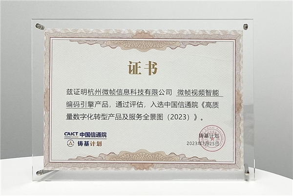 7月27日,由中國信通院主辦的“2023數(shù)字生態(tài)發(fā)展大會(huì)”暨中國信通院“鑄基計(jì)劃”年中會(huì)議在北京召開。本次大會(huì)全面總結(jié)了“鑄基計(jì)劃”上半年度工作成果,并重磅發(fā)布了《高質(zhì)量數(shù)字化轉(zhuǎn)型產(chǎn)品及服務(wù)全景圖(2023)》。微幀科技作為全球領(lǐng)先的視頻編碼及AI解決方案提供商受邀出席會(huì)議,【微幀視頻智能編碼引擎】以行業(yè)領(lǐng)先的編碼性能、不斷突破技術(shù)極限的自研能力,實(shí)力入選全景圖。