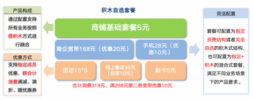 思特奇推出“積木式”商品自由組合解決方案并在移 動行業(yè)落地應用。以一個必選政企商品作為積木底座,N個可選熱門商品作為積木塊的模式,將單一政企業(yè)務復雜參數(shù)變?yōu)榱斜硎降暮唵喂催x,解決政企業(yè)務參數(shù)復雜一線無法快速訂購的痛點,同時將融合優(yōu)惠靈活分攤在各個商品上,提供滿減滿折多種優(yōu)惠方式,解決了優(yōu)惠模式單一的痛點。實現(xiàn)資費標準透明,現(xiàn)場即辦即走。