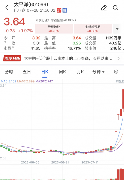 7月28日,太平洋證券再次漲停,截至收盤,成交40.24億元,換手率為16.71%,買一封單107.42萬手,以當(dāng)日收盤價3.64元計(jì)算,約3.91億元。太平洋錄得“四天三漲?!?#xff0c;近4個交易日上漲36.84%,累計(jì)成交118.93億元。最新總市值為248.1億元,較7月23日收盤市值增加66.8億元。