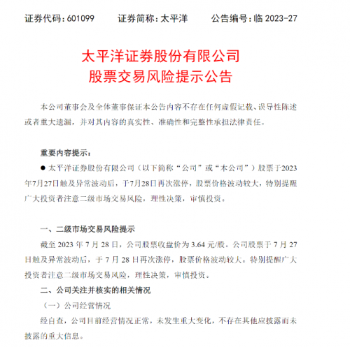 7月28日,太平洋證券發(fā)布股票交易風(fēng)險提示公告,公司股票于2023年7月27日觸及異常波動后,于7月28日再次漲停,股票價格波動較大,特別提醒廣大投資者注意二級市場交易風(fēng)險,理性決策,審慎投資。
