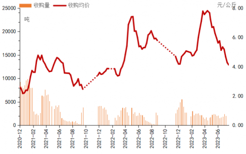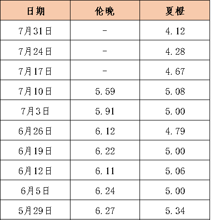 在產(chǎn)地收購方面,截至7月27日,秭歸夏橙已銷售本產(chǎn)季產(chǎn)量的59.38%,走貨速度整體低于去年同期。受降雨天氣影響,貿易商采購意愿減弱,夏橙收購價格及收購量下降。本期秭歸夏橙收購量環(huán)比下跌17.49%。價格方面,本期夏橙收購價格報4.12元/公斤,環(huán)比下跌3.69%,同比下跌34.10%。