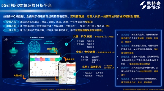 作為數(shù)智化轉(zhuǎn)型的使能者、賦能者、運(yùn)營(yíng)者,思特奇始終走在數(shù)智化探索前列,憑借豐富的5G營(yíng)銷技術(shù)積累和商用經(jīng)驗(yàn),全力支撐運(yùn)營(yíng)商可視化精準(zhǔn)營(yíng)銷業(yè)務(wù)發(fā)展。經(jīng)過對(duì)全國(guó)各地省會(huì)城市的深度調(diào)研,思特奇研發(fā)設(shè)計(jì)出5G可視化智慧運(yùn)營(yíng)分析平臺(tái),以實(shí)現(xiàn)數(shù)據(jù)運(yùn)營(yíng)可視、目標(biāo)過程管控、一線環(huán)節(jié)觸達(dá)、評(píng)價(jià)量化標(biāo)準(zhǔn)為目標(biāo),聚焦業(yè)務(wù)問題,通過數(shù)據(jù)-問題-結(jié)果-反饋進(jìn)行閉環(huán)分析復(fù)盤,加快運(yùn)營(yíng)商公司平臺(tái)型、數(shù)字化、智能化、生態(tài)化轉(zhuǎn)型。