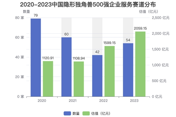 報告顯示,2023中國隱形獨角獸500強企業(yè)服務(wù)賽道獨角獸企業(yè)有54家,估值合計為2059.15億元(如上圖)。根據(jù)BIHU創(chuàng)業(yè)伯樂獨角獸企業(yè)數(shù)據(jù)庫(EMUDB),2021-2023中國隱形獨角獸500強企業(yè)服務(wù)賽道隱形獨角獸企業(yè)同比分別減少19家、減少18家、增加12家;企業(yè)服務(wù)賽道隱形獨角獸企業(yè)估值合計同比分別降低1.07%、增長44.21%、增長28.77%。2023年與2022年相比,企業(yè)服務(wù)賽道隱形獨角獸企業(yè)從42家上漲到54家,增加了12家,漲幅為28.57%,呈現(xiàn)出上升趨勢;估值合計從1599.15億元上漲到2059.15億元,增長了460億元,漲幅為28.77%,呈現(xiàn)出上升趨勢。