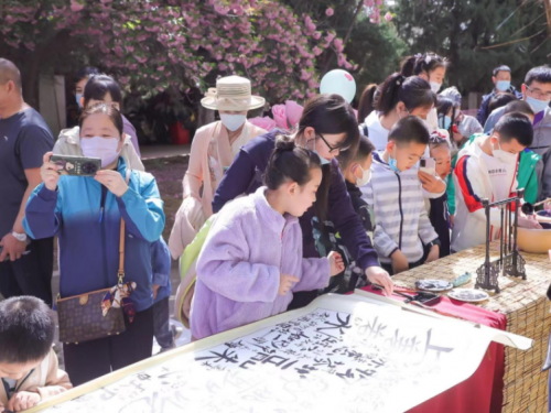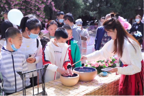 來賓們?cè)谫p櫻的同時(shí)紛紛錄制有聲明信片“我想對(duì)黨說”,體驗(yàn)各式手作、風(fēng)箏制作、DIY團(tuán)扇制作、漢服秀等?!霸搅_衫袂迎春風(fēng),玉刻麒麟腰帶紅?!贝荷ㄏ?#xff0c;飄逸的裙裾、精致的簪花,中華傳統(tǒng)服飾之美與絢爛多姿的國潮風(fēng)交相輝映,在水墨香中感受漢字書法的魅力所在,在詩詞之美中,領(lǐng)略詩意人生的寫照、家國情懷的寄托,傳承詩詞文化,涵養(yǎng)民族精神。