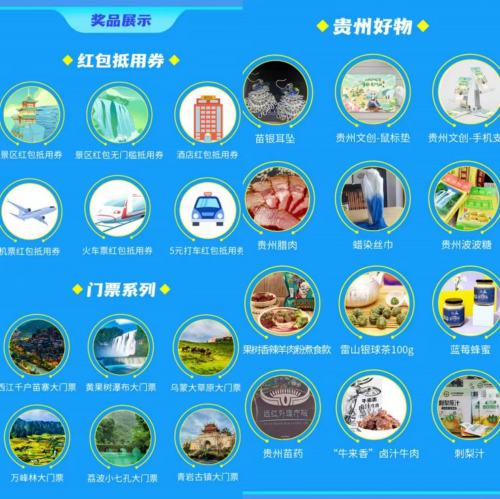 本次盲盒活動獎品重點突出貴州省內景點、文創(chuàng)產品、特色美食。從貴州重點景區(qū)如西江千戶苗寨、黃果樹瀑布、烏蒙大草原、荔波小七孔的大門票,到苗銀耳墜、貴州臘肉、蠟染絲巾、貴州波波糖、貴州苗藥等貴州好物,好玩、好吃、好用一應俱全。此外,盲盒還提供景區(qū)、酒店、機票、火車票、打車紅包抵用券,誠意滿滿。