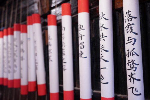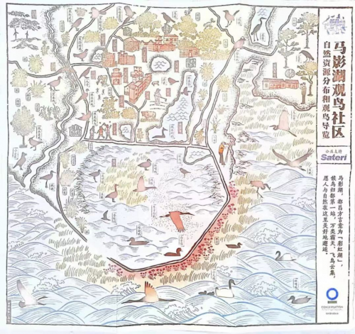 在這個(gè)書屋中,項(xiàng)目團(tuán)隊(duì)別出心裁地規(guī)劃了一個(gè)叫“漢字與鳥”的板塊,包含了從甲骨文到現(xiàn)代所有與鳥相關(guān)的漢字。緊鄰這個(gè)板塊的墻上是一整排純手工制作的傳統(tǒng)卷軸,里面寫滿了與鳥相關(guān)的千古名句。位于大廳正中央的是一幅巨型馬影湖手繪地圖,上面標(biāo)注著當(dāng)?shù)刂饕暮蝤B種類,供參觀者學(xué)習(xí)。