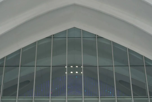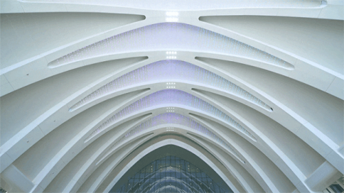 登錄廳“鳥(niǎo)喙”造型凈高34m,頂端懸挑長(zhǎng)度達(dá)到6m。梁柱縱橫交錯(cuò)、網(wǎng)狀交織。八局裝飾采用裝配式設(shè)計(jì)施工方法,現(xiàn)場(chǎng)組裝、單元吊裝、多條安裝線流水施工,完成1400塊雙曲異形超長(zhǎng)鋁板快速安裝,輔以9953盞Dmax-512系統(tǒng)RGBW調(diào)光燈,營(yíng)造流光溢彩的視覺(jué)效果,讓建筑空間更具藝術(shù)特性。