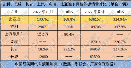 中國經(jīng)濟(jì)網(wǎng)記者通過梳理廠家公開的數(shù)據(jù)和乘聯(lián)會(huì)發(fā)布的數(shù)據(jù)發(fā)現(xiàn),6月,比亞迪乘用車、吉利、長安乘用車、長城的銷量分別為133762輛、126595輛、118303輛、101186輛,同比分別上漲168.8%%、26%、37.6%、0.52%;上半年累計(jì)銷量分別為641350輛、613842輛、629175輛、518525輛,同比分別上漲314.9%、-3%、-4.61%、-16.12%。?
