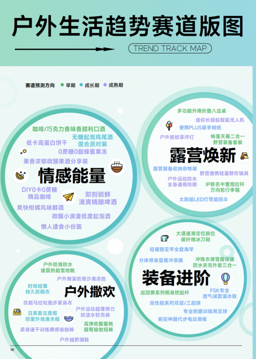 巨量算數(shù) & 算數(shù)電商研究院綜合趨勢賽道評估模型,篩選出了 38 個戶外生活行業(yè)趨勢賽道,覆蓋運(yùn)動用品、戶外用品、箱包、方便食品、酒飲等多板塊,我們認(rèn)為推動品類的創(chuàng)新力集中在功能創(chuàng)新、場景創(chuàng)新和情感創(chuàng)新。