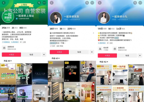 因此,在確定了以解決業(yè)主在家裝過程中的痛點問題為主要目標(biāo)后,一起裝修網(wǎng)在抖音搭建了多城市、針對細分賽道、具有不同人設(shè)風(fēng)格的IP賬號矩陣,同時進行矩陣差異化運營。