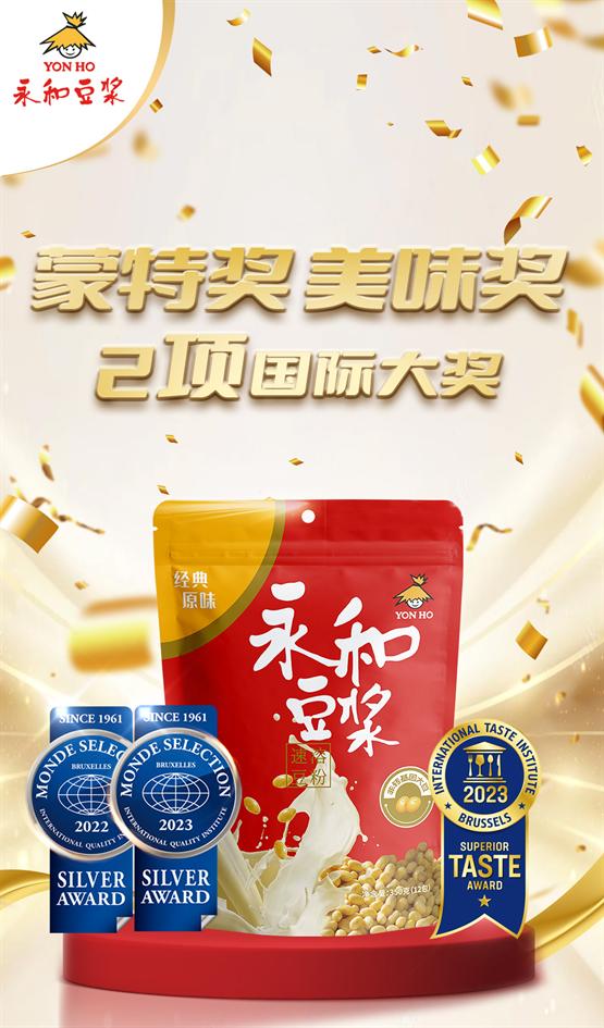 2022-2023年,永和食品旗下350g經(jīng)典原味豆?jié){粉先后蟬聯(lián)2屆國際蒙特獎,并與純豆?jié){粉一起榮獲國際美味獎風(fēng)味認證。硬核實力,向全球消費者展現(xiàn)出了中國豆?jié){品牌的品質(zhì)與自信。國際大獎?wù)J證的健康飲品,值得信賴!
