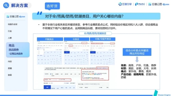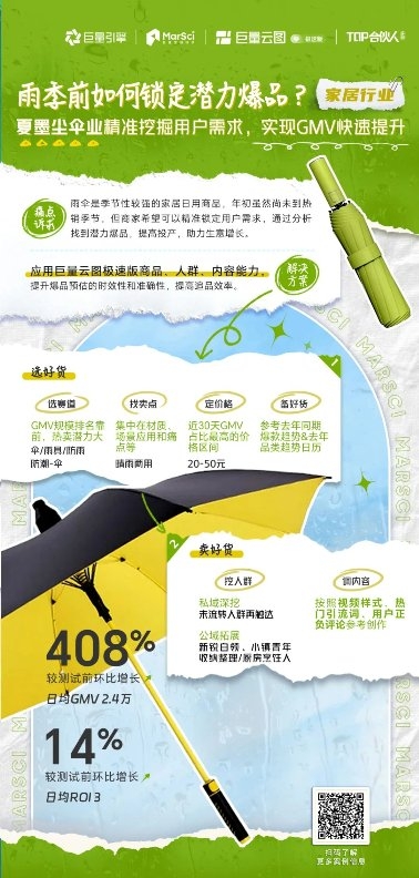 作為家居百貨行業(yè)代表,雨傘品類季節(jié)性更強(qiáng),上述問題也更為凸顯,年初雖然尚未到雨季熱銷節(jié)點(diǎn),但工廠希望可以精準(zhǔn)鎖定用戶需求,提前儲備新的爆品,未雨綢繆。如何準(zhǔn)確選出潛力爆品,并篩選精準(zhǔn)人群提高投產(chǎn),助力生意增長?