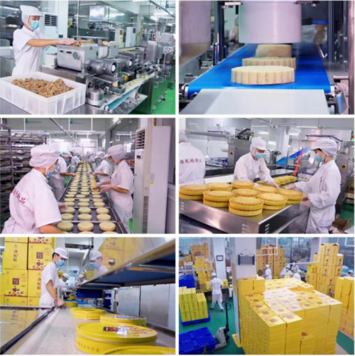 一直以來,海龍閣嚴格把控月餅制作流程,從領(lǐng)料、選餡、稱餡、稱皮、自動成型,到1次烘烤、掃蛋,2次烘烤、冷卻,再到膠托消毒、月餅入托、金屬檢測、自動包裝、檢查挑選、入庫儲存,都遵循嚴謹?shù)囊?guī)定和流程,確保各食材的比例精確、制作步驟合理、烘烤溫度適宜,以做出美味的月餅。
