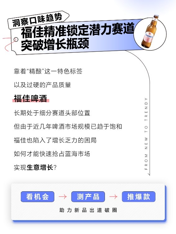 福佳啤酒在巨量云圖“新品推爆”全能力的加持下,通過商品多維度洞察快速了解市場趨勢(shì),并利用「新品實(shí)驗(yàn)室」進(jìn)行敏捷、準(zhǔn)確地測品,有效降低上新試錯(cuò)成本,精準(zhǔn)定位潛力貨品、高價(jià)值人群以及營銷場景,在實(shí)現(xiàn)短期生意增量爆發(fā)的同時(shí),也為品牌在抖音平臺(tái)長效經(jīng)營累積了人群資產(chǎn)。