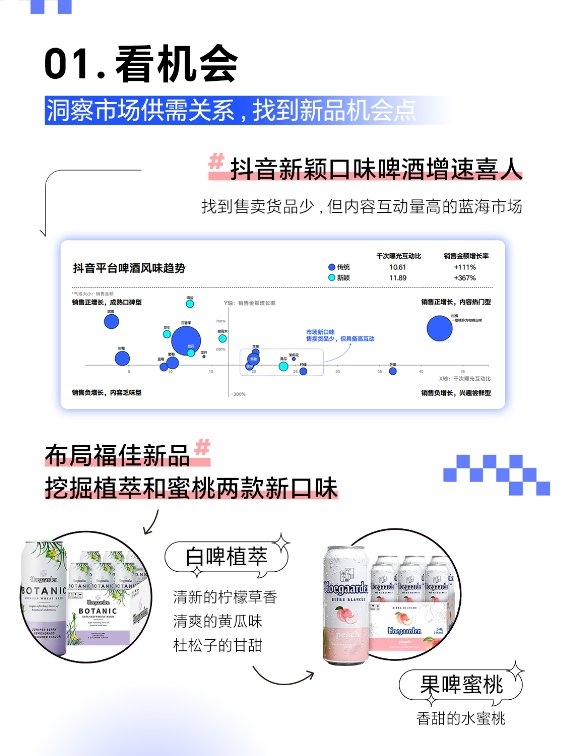 基于巨量云圖商品洞察能力,福佳對(duì)抖音啤酒大盤現(xiàn)狀及細(xì)分賽道趨勢(shì)進(jìn)行分析,發(fā)現(xiàn)抖音啤酒細(xì)分類目均正增長,其中白啤增長最可觀,果啤趨向高客單商品。進(jìn)一步洞察抖音啤酒風(fēng)味趨勢(shì)發(fā)現(xiàn),新穎口味啤酒增速喜人,黃瓜和桃子兩種口味受抖音消費(fèi)者關(guān)注,但市場的針對(duì)性供給較少,蘊(yùn)含巨大的發(fā)展?jié)摿?這恰巧與福佳現(xiàn)有產(chǎn)品組合高度匹配。