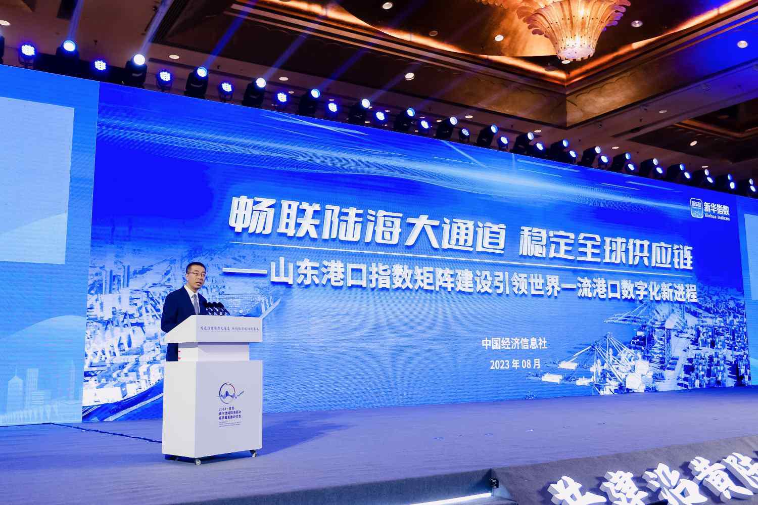 圖為中國(guó)經(jīng)濟(jì)信息社指數(shù)事業(yè)部主任曹占忠發(fā)布解讀《新華·山東港口大宗商品指數(shù)年度運(yùn)行報(bào)告(2023)》。