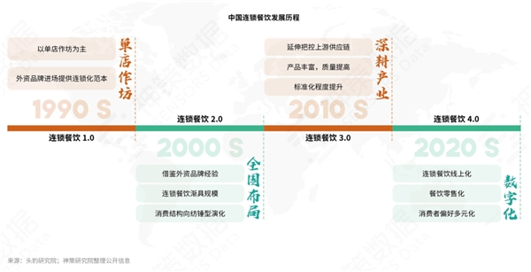 中國(guó)連鎖餐飲發(fā)展經(jīng)歷了“單店作坊、全國(guó)布局、深耕產(chǎn)業(yè)、數(shù)字化”四個(gè)階段,目前已經(jīng)進(jìn)入 4.0 數(shù)字化階段,呈現(xiàn)線上化、零售化、消費(fèi)者偏好多元化的趨勢(shì)。
