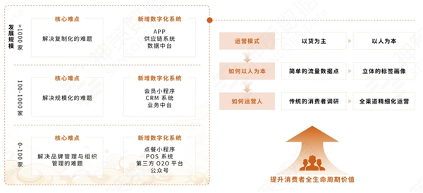 2、在實(shí)現(xiàn)消費(fèi)者全生命周期價(jià)值運(yùn)營(yíng)時(shí),不同規(guī)模的連鎖餐飲品牌需關(guān)注不同的重點(diǎn):小而美的企業(yè)聚焦數(shù)字化鏈條前端板塊,規(guī)?;钠髽I(yè)更聚焦雙中臺(tái)的搭建。