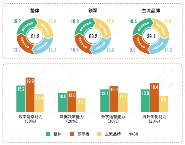 國(guó)貨連鎖餐飲品牌的數(shù)字化營(yíng)銷(xiāo)能力處于中游水平,各領(lǐng)域均有較大提升空間,從細(xì)項(xiàng)上來(lái)看,國(guó)貨連鎖餐飲在【數(shù)據(jù)決策能力】得分略低,應(yīng)重點(diǎn)加強(qiáng);領(lǐng)軍者在模型各方面均較領(lǐng)先,其中【數(shù)字洞察能力】和【數(shù)字運(yùn)營(yíng)能力】是關(guān)鍵;主流品牌的數(shù)字化營(yíng)銷(xiāo)能力還偏弱,各領(lǐng)域的建設(shè)力度均不夠。