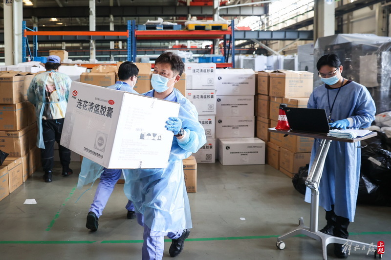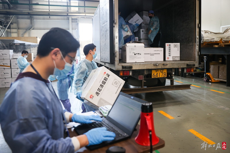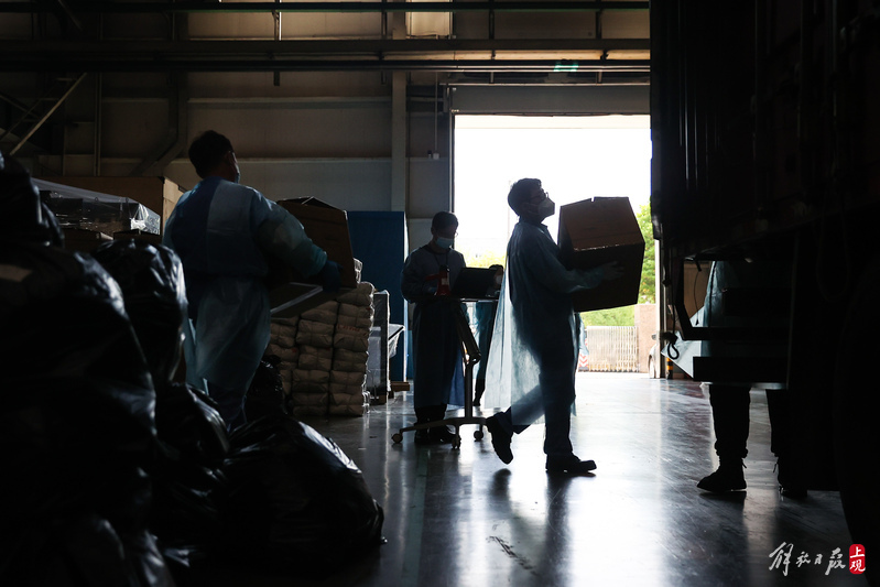 為不增加基層負擔,寶山區(qū)啟用7個分揀點對應13個街鎮(zhèn)園區(qū),由招募來的企業(yè)職工及志愿者流水線作業(yè),對物資開展卸貨、分裝。
