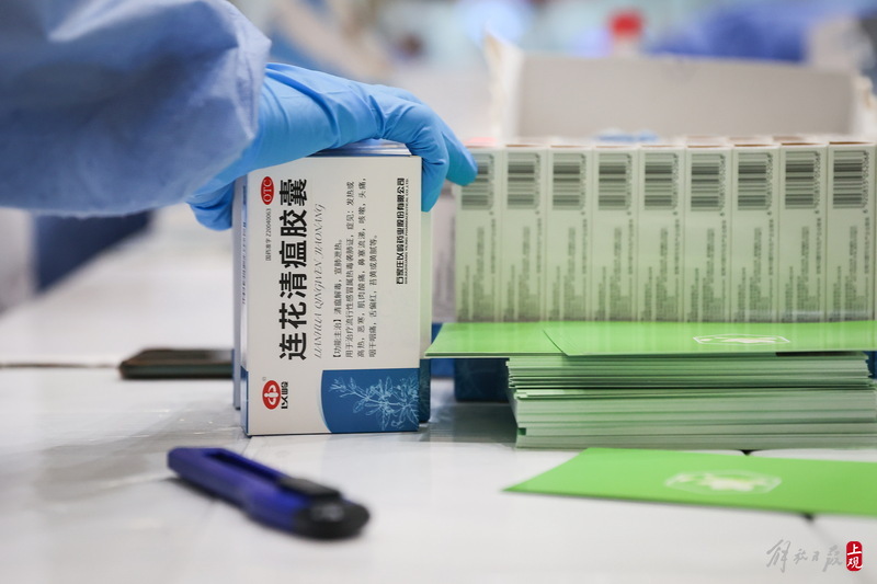 每個服務包內有口罩、連花清瘟膠囊、抗原測試盒,并附有一張上海市疫情防控工作領導小組辦公室的心意卡。
