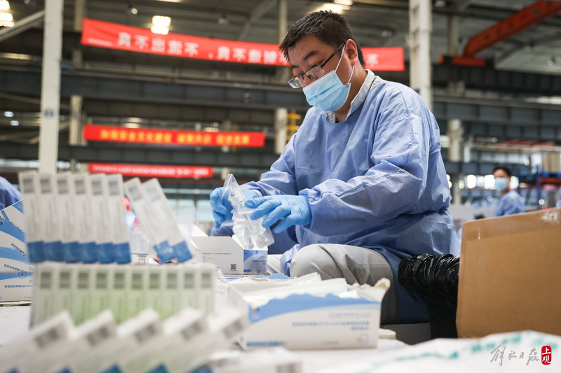 2022年4月11日,上觀新聞記者來到業(yè)績路上的寶山防疫服務包最大的分裝車間,這里原本是上海漢虹精密機械有限公司的生產廠房,但該廠百余名志愿者從早上八點就開始分批次投入到了防疫物資的分裝“流水線”作業(yè)中,一張張清單核對,一件件物資分裝,現(xiàn)場熱火朝天。