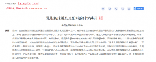 4月7日,《中國(guó)食品學(xué)報(bào)》刊發(fā)中國(guó)食品學(xué)界剛剛?cè)〉玫囊粋€(gè)突破性科學(xué)共識(shí)成果——中國(guó)工程院院士、中國(guó)農(nóng)業(yè)大學(xué)營(yíng)養(yǎng)與健康研究院院長(zhǎng)任發(fā)政等近20位中國(guó)食品科學(xué)技術(shù)學(xué)會(huì)權(quán)威專家形成了國(guó)內(nèi)首個(gè)《乳脂肪球膜及其配料的科學(xué)共識(shí)》(以下簡(jiǎn)稱“乳脂肪球膜科學(xué)共識(shí)”),共識(shí)明確指出,嬰幼兒配方乳粉添加“富含乳脂肪球膜的乳清蛋白粉”后可促進(jìn)嬰兒大腦認(rèn)知發(fā)育、增強(qiáng)嬰兒免疫力。