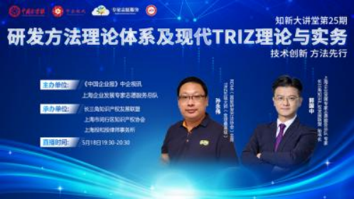 5月18日,中企視訊《知新大講堂》第25期節(jié)目線上開播。RDMI(國際研發(fā)方法協(xié)會)主席、TRIZ五級大師(全球最高級)、DFSS(六西格瑪設(shè)計)黑帶大師孫永偉博士做客中企視訊直播間,長三角知識產(chǎn)權(quán)發(fā)展聯(lián)盟秘書長郭國中擔(dān)任主持人,介紹了現(xiàn)代TRIZ理論體系的組成以及它在技術(shù)創(chuàng)新、新產(chǎn)品研發(fā)、專利布局、規(guī)避、挖掘等專利戰(zhàn)略、運(yùn)用創(chuàng)新大幅降本等方面的重要作用。