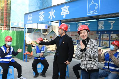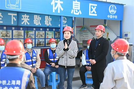 11月2日下午,在中鐵上海局三公司創(chuàng)智天地項目部工地,黨的二十大代表,黨的二十代代表,國家一級演員,新一代黃梅戲藝術傳承人,安徽省黃梅戲劇院的袁媛正在為工友們表演經(jīng)典的黃梅戲片段。