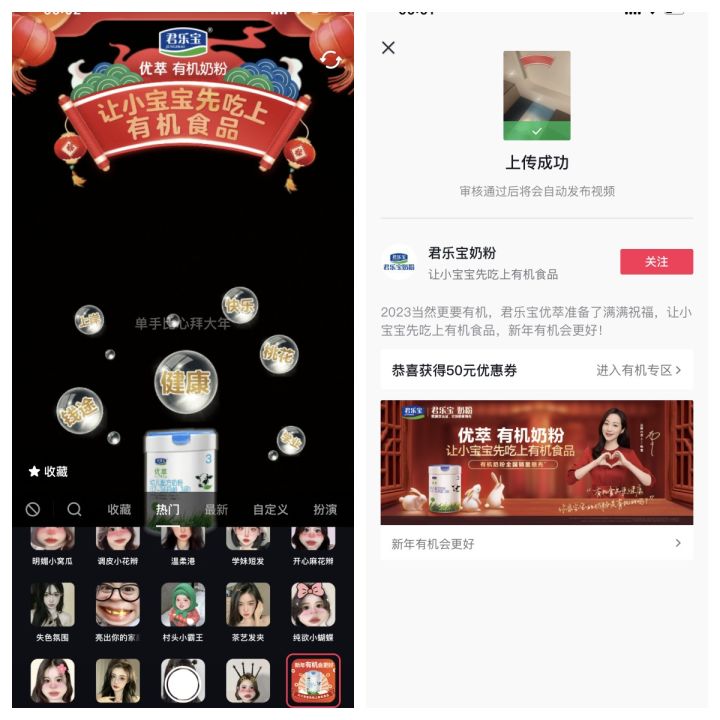 除了用戶喜聞樂見的直播欄目流量加持之外,優(yōu)萃有機(jī)奶粉還充分借勢品牌卡券植入從攻占用戶心智到構(gòu)建雙方鏈接。如在放煙花、猜燈謎、拍新年視頻等創(chuàng)意互動(dòng)中,使得優(yōu)萃有機(jī)奶粉的品牌信息在活動(dòng)頁面多次露出,讓用戶潛移默化對品牌產(chǎn)生認(rèn)同與共鳴,無形中為品牌帶去巨大的人群增量和品牌曝光量。與此同時(shí),用戶心智強(qiáng)種草對品牌后續(xù)的銷售也起到了關(guān)鍵的推動(dòng)作用,對此優(yōu)萃有機(jī)奶粉直擊落地銷售轉(zhuǎn)化,以大幅優(yōu)惠更高效地激發(fā)用戶購買欲,例如通過游戲獎(jiǎng)勵(lì)的形式發(fā)放品牌優(yōu)惠券,并引導(dǎo)用戶進(jìn)入有機(jī)專區(qū),直接帶動(dòng)優(yōu)萃有機(jī)奶粉的生意轉(zhuǎn)化。