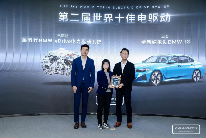 世界十佳動(dòng)力系統(tǒng)評(píng)委會(huì)秘書(shū)長(zhǎng)孫浩然、汽車評(píng)價(jià)研究院副院長(zhǎng)李鏑鋒為BMW企業(yè)代表頒獎(jiǎng)