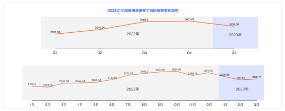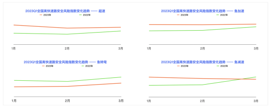 數(shù)據(jù)顯示,全國高快速路的安全險(xiǎn)指數(shù)環(huán)比2022第四季度下降8.16%,全國高快速路的危險(xiǎn)駕駛行為(即三急一超:急加速、急減速、急轉(zhuǎn)彎和超速)與2022第一季度比較,超速、急轉(zhuǎn)彎的變化趨勢(shì)一致,急加速、急減速則在2023年3月呈現(xiàn)下降向好趨勢(shì)。