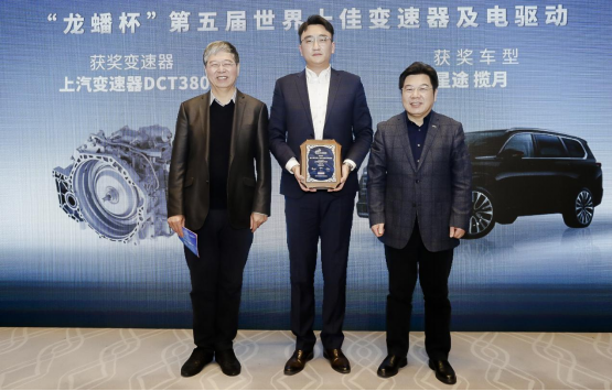 汽車評(píng)價(jià)研究院院長(zhǎng)李慶文(左1)與中國(guó)汽車工業(yè)協(xié)會(huì)副秘書長(zhǎng)羅軍民(右1)為上汽變速器市場(chǎng)營(yíng)銷負(fù)責(zé)人王含東(中)頒獎(jiǎng)