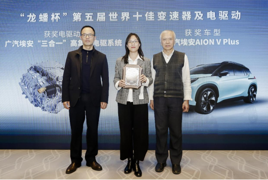 電動(dòng)汽車電驅(qū)動(dòng)系統(tǒng)全產(chǎn)業(yè)鏈技術(shù)創(chuàng)新戰(zhàn)略聯(lián)盟理事長(zhǎng)貢俊(左1)與清華大學(xué)車輛與運(yùn)載學(xué)院教授宋健(右1)為廣汽埃安品牌傳播部公關(guān)經(jīng)理潘昱(中)頒獎(jiǎng)