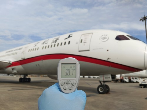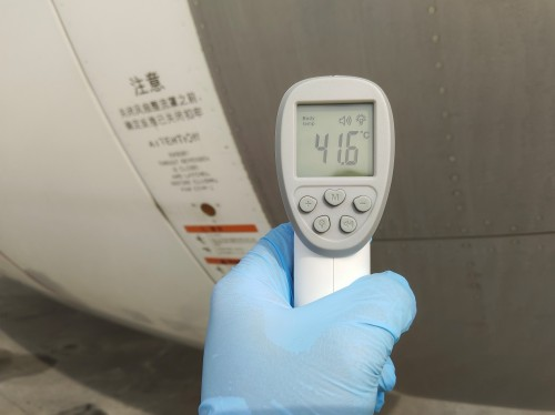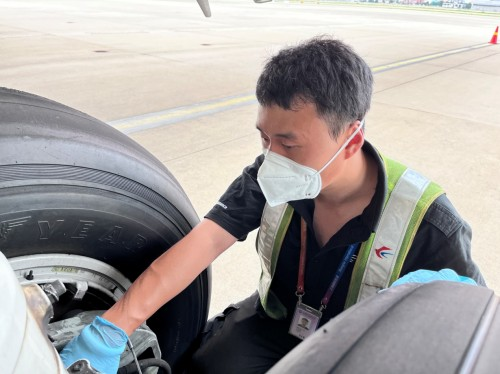 擦拭飛機起落架鏡面是航線保障中很尋常的一項工作,但由于今天外部氣溫較高,吸油棉接觸飛機鏡面后,東航機務(wù)員工的手心瞬間感覺炙熱