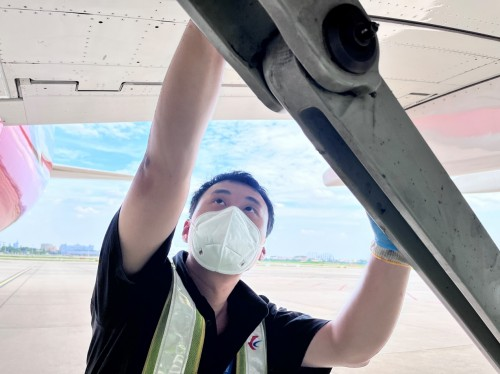 由于溫度較高,機務(wù)人員細心地檢查封存膠帶的粘性,避免由于高溫軟化或脫膠,以及對飛機表面產(chǎn)生腐蝕。雖然在機腹陰涼處,兩位機務(wù)小伙還是感覺層層熱浪