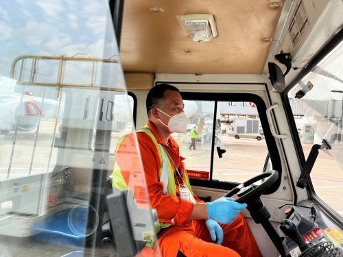 MU6328航班到達行李運送中,開窗通風(fēng)才能讓小小的行李牽引車車內(nèi)溫度降低點。