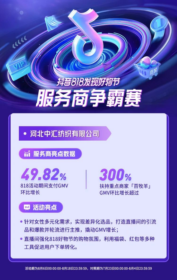 河北中匯紡織有限公司在其所服務(wù)的女裝直播間,深挖女性消費(fèi)個(gè)性需求,選出小眾的產(chǎn)品,打造兼具引流品和爆品的貨盤;與此同時(shí),渲染818氛圍,利用多種玩法(如福袋、紅包等),結(jié)合主播引導(dǎo),促進(jìn)粉絲下單?;顒?dòng)期,支付GMV環(huán)比增長(zhǎng)49.82%。