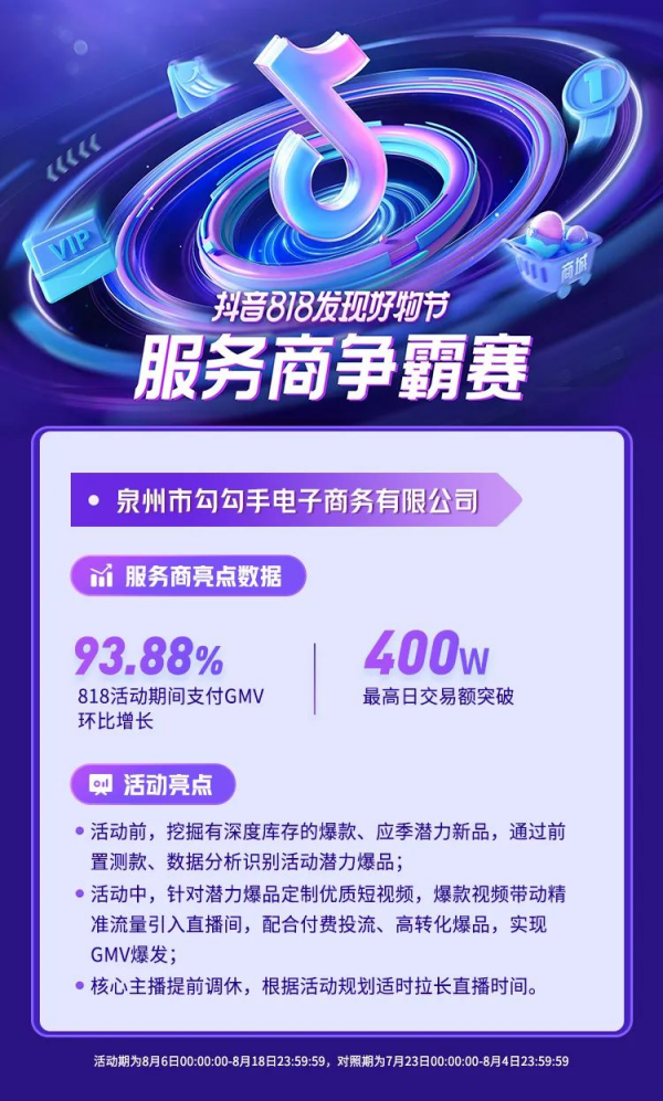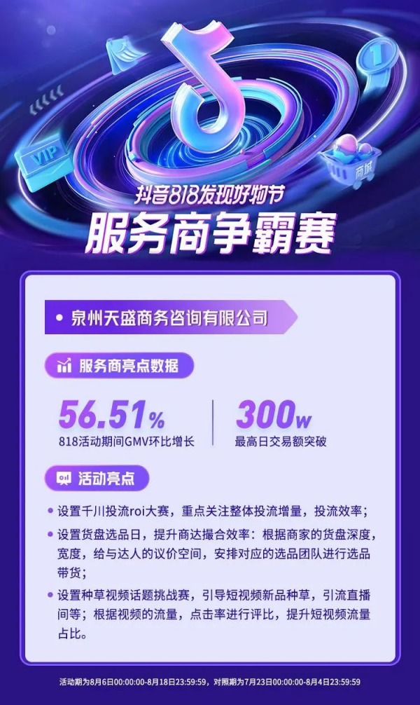 此次活動(dòng)中,抖音818服務(wù)商活動(dòng)帶來(lái)了潛力新星直播間、服務(wù)商排位賽等多元玩法,為服務(wù)商與商家?guī)?lái)落到實(shí)處的動(dòng)力。相比過(guò)往大促,本次活動(dòng)實(shí)時(shí)投流席位大幅增加;服務(wù)商完成活動(dòng)GMV沖刺任務(wù),更可瓜分50w千川消返紅包。