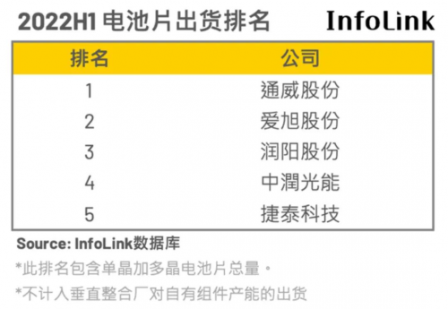 據(jù)PVInfoLink統(tǒng)計(jì),今年上半年晶硅電池總產(chǎn)量約135.5GW。TOP5的通威股份、愛旭股份、潤陽股份、中潤光能、捷泰科技,總出貨量約59GW,占43.54%。另有投研機(jī)構(gòu)統(tǒng)計(jì),TOP5出貨中,通威出貨約為22.5GW、愛旭出貨約為17GW、潤陽出貨約為13GW、中宇出貨約為5GW,捷泰出貨約為3GW。