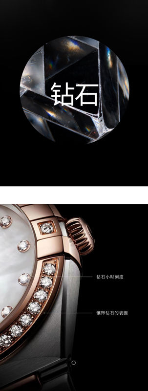 鉆石源自天地自然,晶瑩華美。歐米茄只甄選凈度從無瑕到VVS級別的“Top Wesselton”白色鉆石,經(jīng)高水準(zhǔn)的專業(yè)切割工藝和精妙設(shè)計,或鑲于表圈,或嵌在表盤,以璀璨光芒詮釋永恒之美。