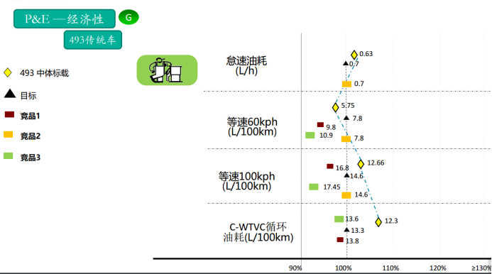 當(dāng)車輛怠速時(shí),發(fā)動(dòng)機(jī)的轉(zhuǎn)速僅600轉(zhuǎn),在省油的同時(shí),又進(jìn)一步降低了發(fā)動(dòng)機(jī)噪音,百公里油耗較同類機(jī)型油耗低5%以上。它的額定功率點(diǎn)燃油消耗率為215 g/(kW·h),在WTVC綜合油耗及等速油耗均優(yōu)于競(jìng)品。
