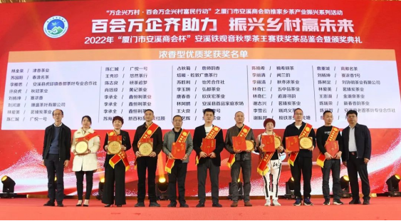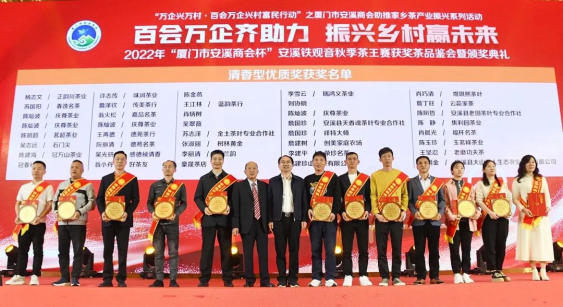 2月24日,由廈門市工商聯(lián)(總商會)、安溪縣人民政府主辦,廈門市安溪商會承辦,中共安溪縣委統(tǒng)戰(zhàn)部、安溪縣茶業(yè)管理委員會辦公室、安溪縣工商聯(lián)協(xié)辦的2022年“廈門市安溪商會杯”安溪鐵觀音秋季茶王賽獲獎茶品鑒會暨頒獎典禮在廈門佰翔五通酒店盛大舉行。本次活動是為了進一步落實廈門市工商聯(lián)和安溪縣人民政府提出的“萬企興萬村·百會萬企興村富民行動”計劃——廈門市安溪商會助推家鄉(xiāng)茶產(chǎn)業(yè)振興活動,也是“廈門企業(yè)家日”配套活動之一。