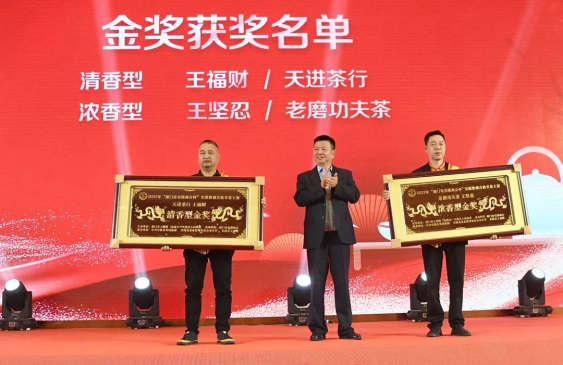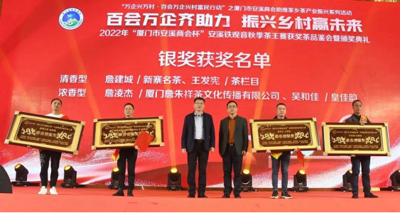 安溪縣人民政府副縣長洪天陽和廈門市安溪商會會長鐘江波頒發(fā)清香型優(yōu)質(zhì)獎牌匾和證書