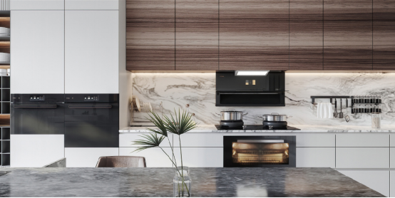 下方烹飪區(qū)爐頭火力達到4.5kw,灶具加上了隔熱聚能罩,夏天開大火也不用擔心太燙手,設計很貼心。消毒柜款的機柜有150L的大空間,通過紫外線+臭氧雙重消殺,除菌率可達99.9%,加上低溫雙效烘干排氣的設計,保持內部干爽,衛(wèi)生健康;如果選擇蒸烤箱款,蒸烤區(qū)運用溫濕雙控科技,通過精準控溫、自主控濕實現大師級烹飪效果,同時擁有煙灶、煙蒸等多種智能聯動。